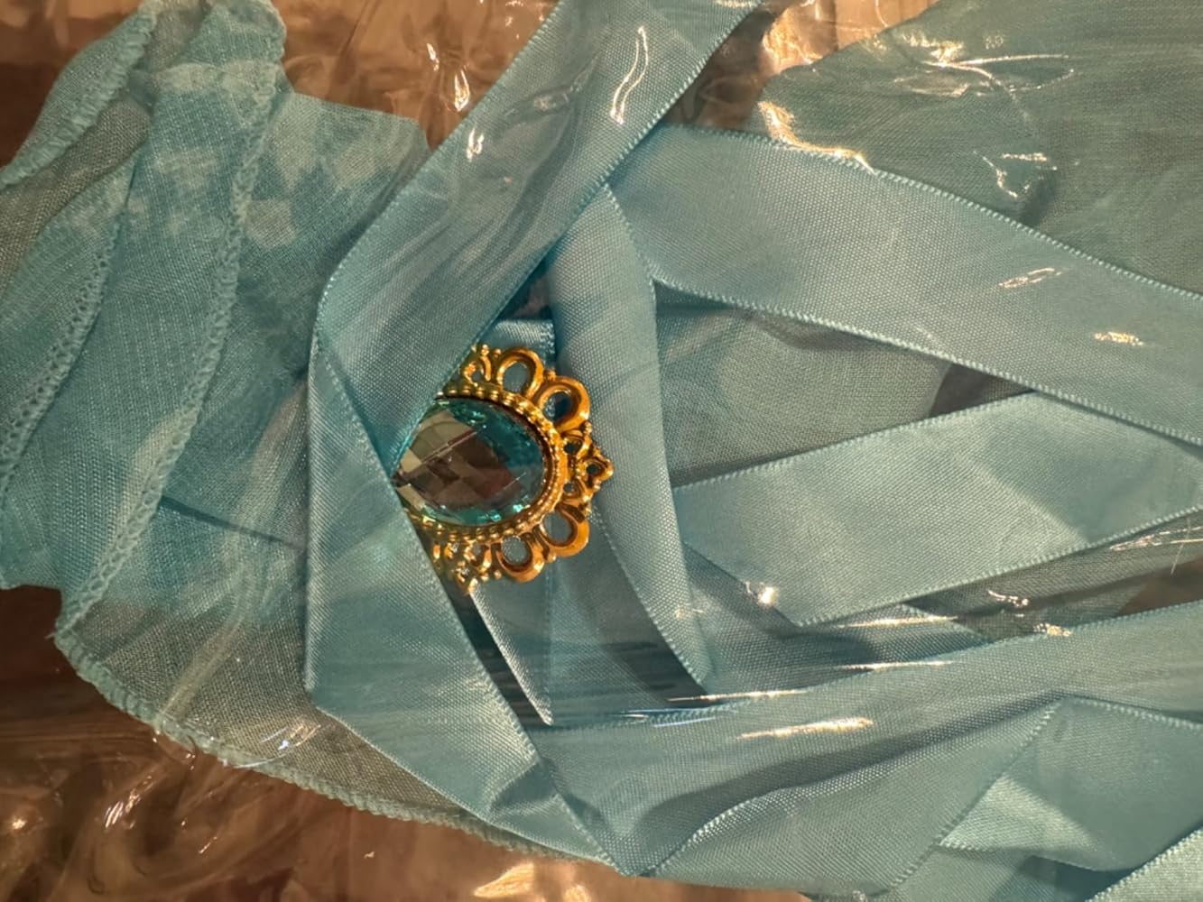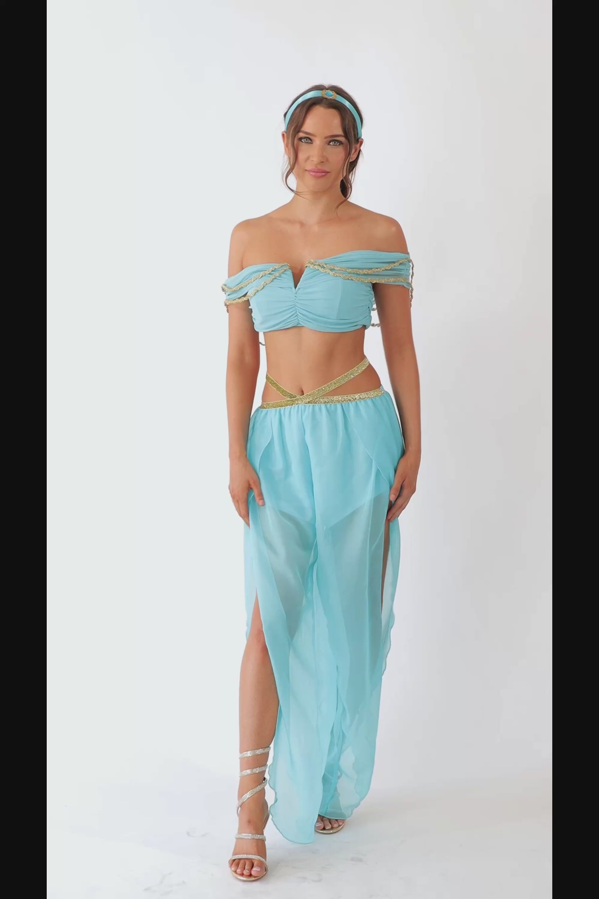 This costume features an off-the-shoulder top made of chiffon fabric, beautifully draped and decorated with intricate gold lace that flows gracefully over the arms. The matching pants are styled like lantern pants and have a shimmering gold trim at the waist. The jeweled headband adds a final touch of royalty to complete the look.