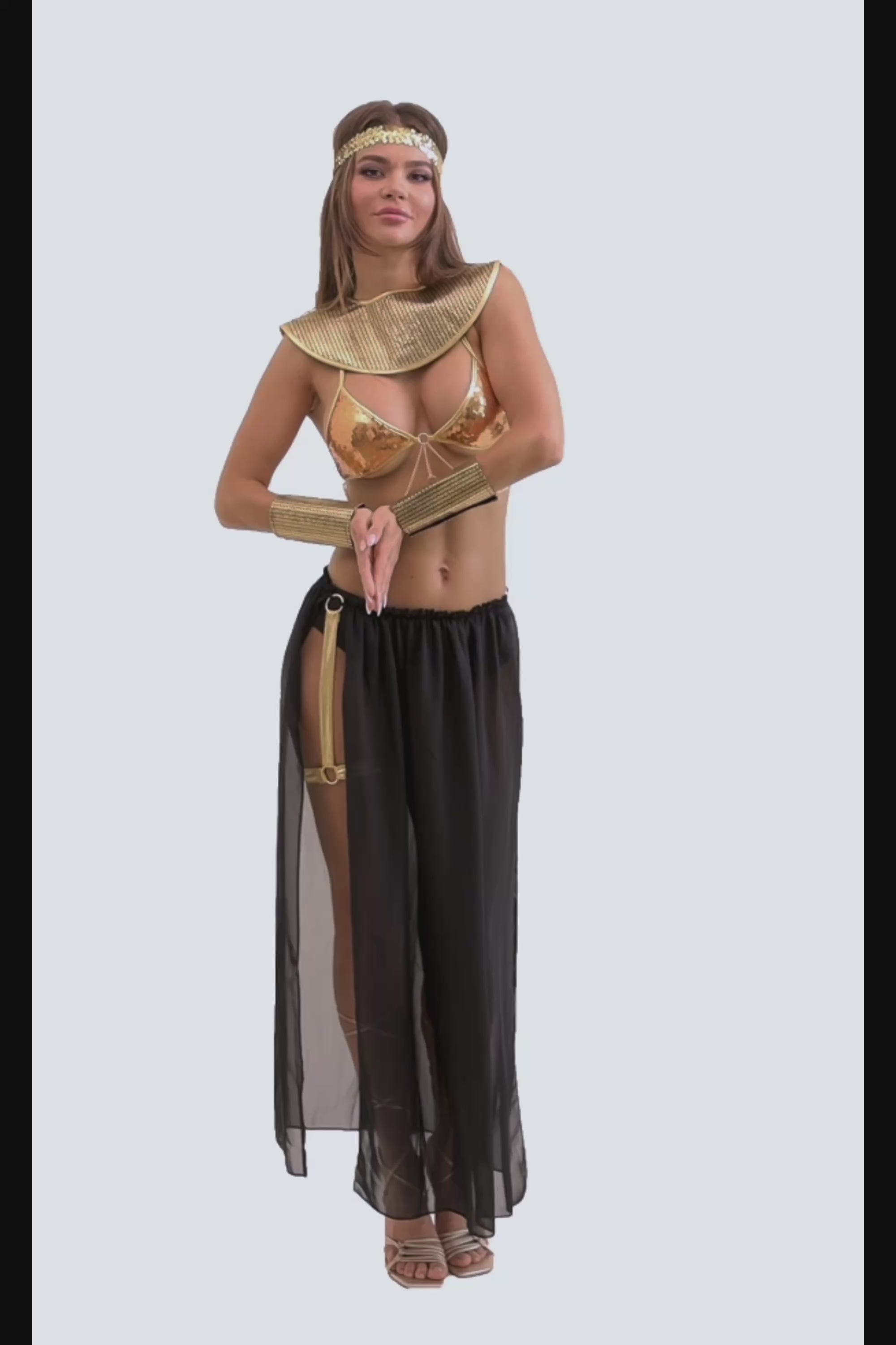 The bra top is made of shimmering sequined fabric and includes adjustable ties, allowing it to comfortably fit women who wear sizes 0 to 4. The matching skirt is also adjustable and flows elegantly with your movement. It features a leg strap that ties securely around your thigh for added style and fit.