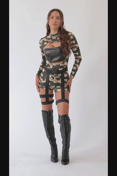 The romper features an open front design that reveals the faux leather bralette underneath. This unique detail adds a sense of mystery and sexiness to the overall look.